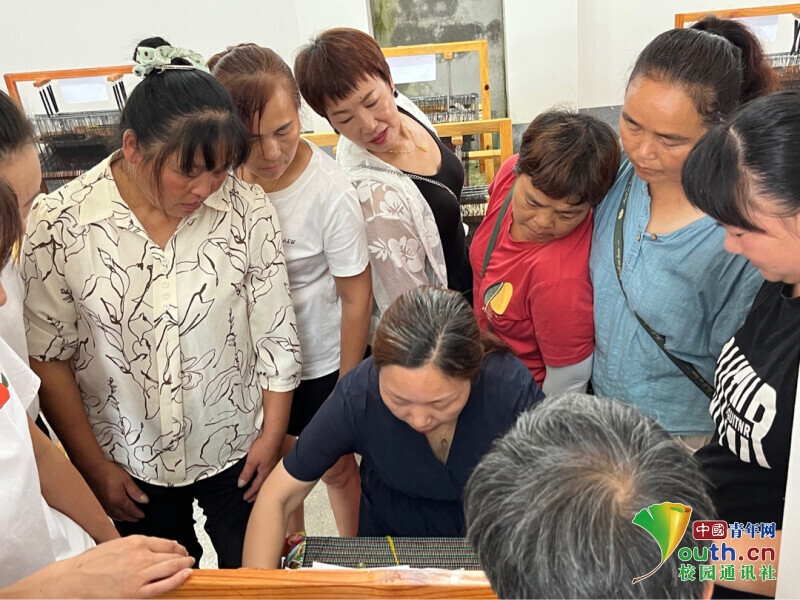 图为田若兰为鸭松溪妇女示范正确的编织技术,鸭松溪妇女们积极地围在一起观摩学习(中国青年网通讯员 李倩九月 供图)