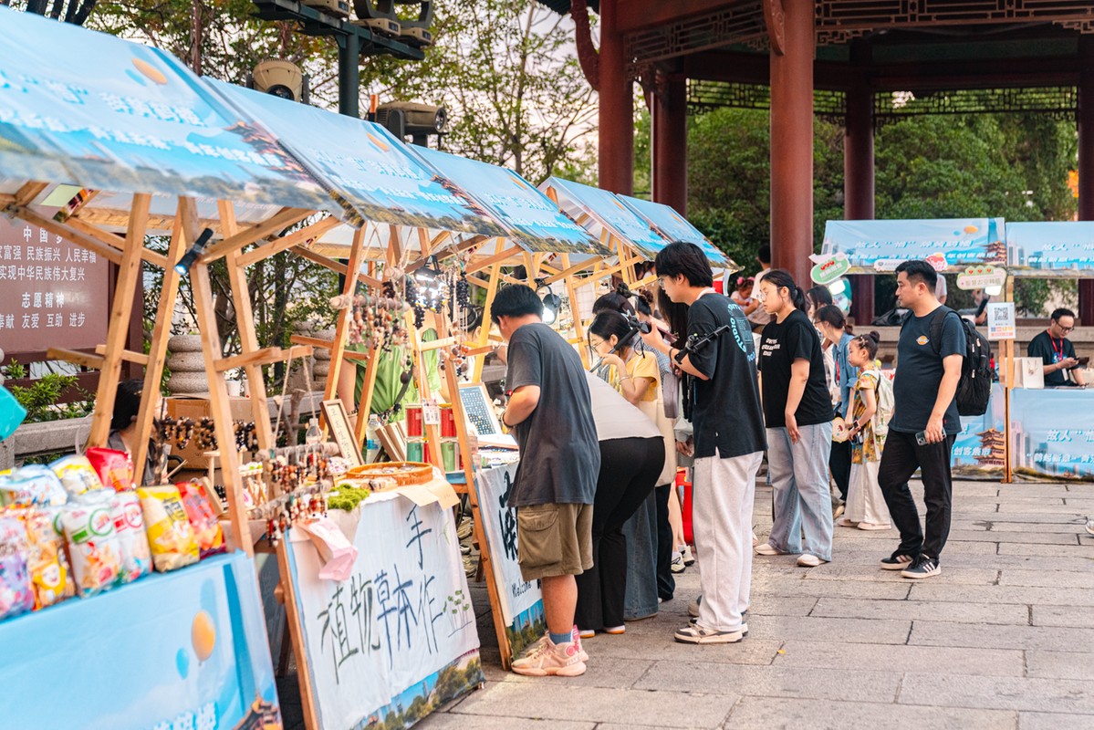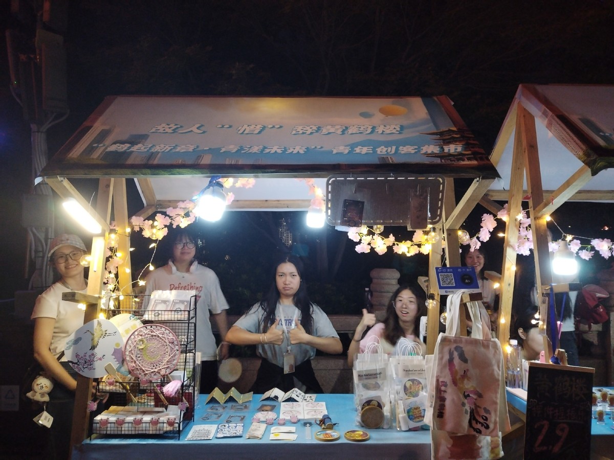 在黄鹤楼前广场,“鹤起新章·青漾未来”青年创客集市每晚活力开市。该集市由会展经济与管理专业B2301班学生团队策划运营,不仅为校内外青年创客提供与了展示平台,更让传统文化以年轻化姿态走进大众生活。集市中,文化产业管理专业B2202班(文创方向)学生的作品格外吸睛——他们以黄鹤楼“仙鹤”“祥云”等千年祥瑞文化为灵感,开发出系列文创产品。通过市场化运营尝试,这些作品既让游客带走了“可触摸的黄鹤楼记忆”,也为文化传承与商业创新的融合探索了新路径,精准呼应了社会对青年创新创业的支持需求。