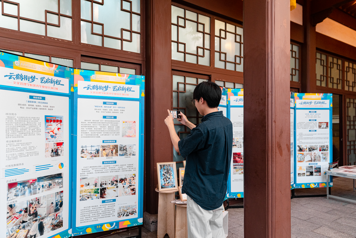 学院首次将优秀毕业设计展搬进国家5A级景区黄鹤楼,于景区紫竹苑特设“云鹤衔梦·艺启新程”专属展区。会展经济与管理专业B2201班学生团队全程主导策展工作,从展区整体规划到现场细节布置,全程深度参与、专业把控,充分展现了扎实的专业功底与实践能力。展览精选2021级电子商务、文化产业管理、会展经济与管理三个本科专业的优秀毕业设计项目,集中呈现了学院毕业设计“进景区、进商圈、进社区、进乡村”的教学改革成果。这些毕业设计紧扣真实社会需求,成果在荆楚大地落地生花,是文化管理学院深化产教融合、强化项目实战,培养高素质应用型“新商科”人才的生动写照。