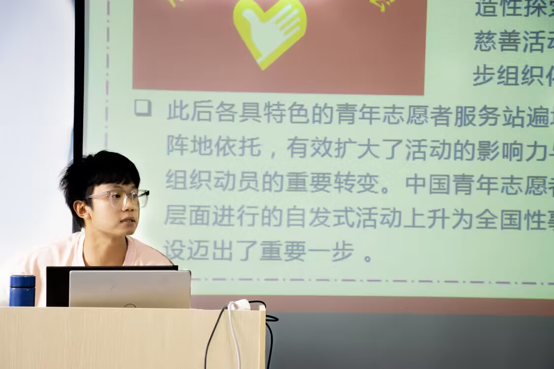 张老师分别从新民主主义革命时期“英勇救国”为主线的青年志愿服务、社会主义革命和建设期以“义务奉献”为主线的青年志愿服务、改革开放和社会主义现代化建设新时期以“友爱互助”为主线的青年志愿服务、新时代以“两个同行”为主线的青年志愿服务四个不同的方面展开讲述,梳理中国青年志愿服务的发展历程。从新民主主义时期起就已经有了青年志愿者的身影出现,他们率先觉醒、拯救民族危亡、诠释志愿精神。就像毛主席曾说:青年是“民族解放先锋队”。在国家成立初期,国内各项事业百废待兴,有一大批在中国共产党带领下的先锋青年志愿者挺身而出,为国家事业奉献自我。其中不乏像王进喜、雷锋这样的优秀青年,为党和国家事业发展献出宝贵生命。而从他们身上所体现出的“铁人精神”“雷锋精神”也激励着一代又一代的青年们。在社会主义现代化建设时期“青年志愿者协会”在党和国家的支持下成立,志愿者不仅仅只是一种身份,其中的精神内涵更广泛的影响着青年。就在刚刚过去不久的疫情时期,正是有各个层面的志愿者的帮助,我们才能拥有现如今的安稳。青年的力量尤为强大,青年志愿者的服务力量也尤为重要。生逢其时,青年当担此大任。