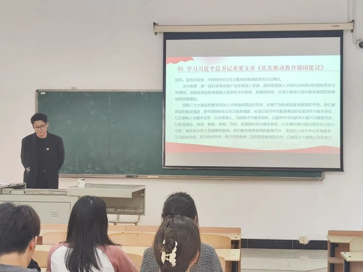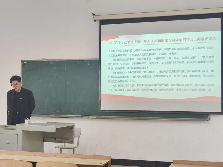 会议开始,全体肃立,奏唱国歌。随后,陈雨同志带领参会同志重温入党誓词,在黑思博同志的带领下,同志们先后学习了习近平在庆祝中华人民共和国成立74周年招待会上的重要讲话、习近平在中共中央政治局第八次集体学习上的重要讲话、习近平总书记重要文章《扎实推动教育强国建设》。