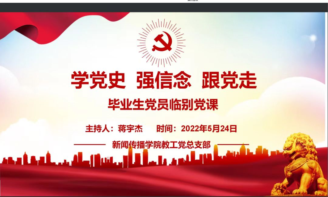 为强化对毕业生党员的理想信念教育,进一步提升毕业生党员的党性修养,提醒毕业生党员们时刻牢记党员身份,牢记党员的初心使命,无论奔赴什么工作岗位,都要充分发挥党员的先锋模范作用。新闻传播学院于2022年5月24日18点15分开展线上毕业生党员临别党课。会议由蒋宇杰老师主持开展。