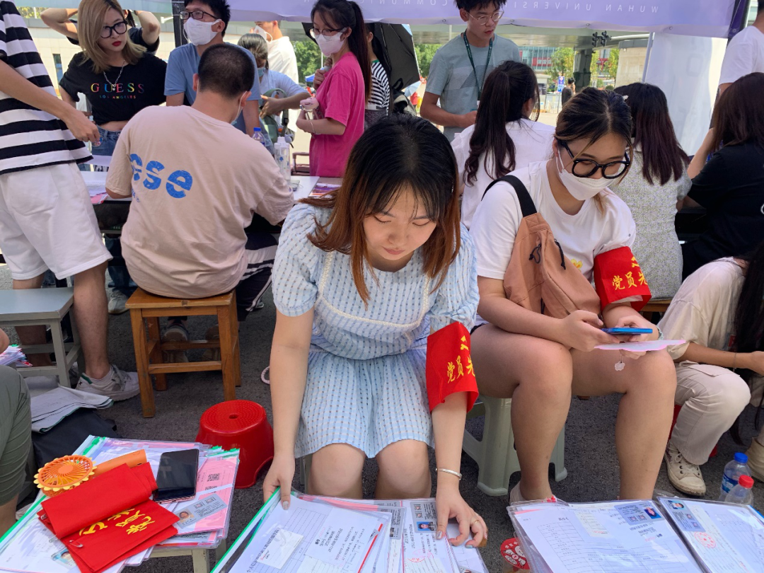 (少数民族学生党员郝程同志在党员服务驿站为新生办理报道手续)