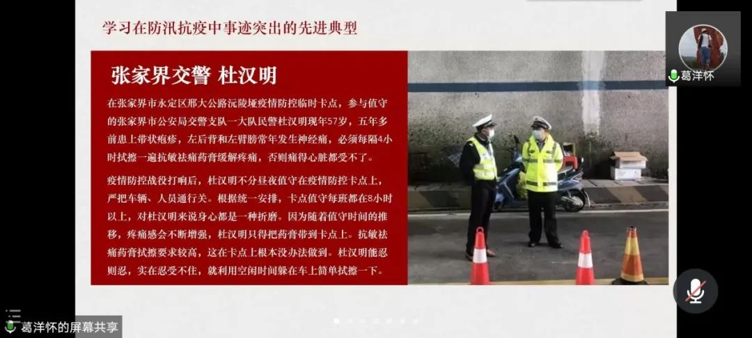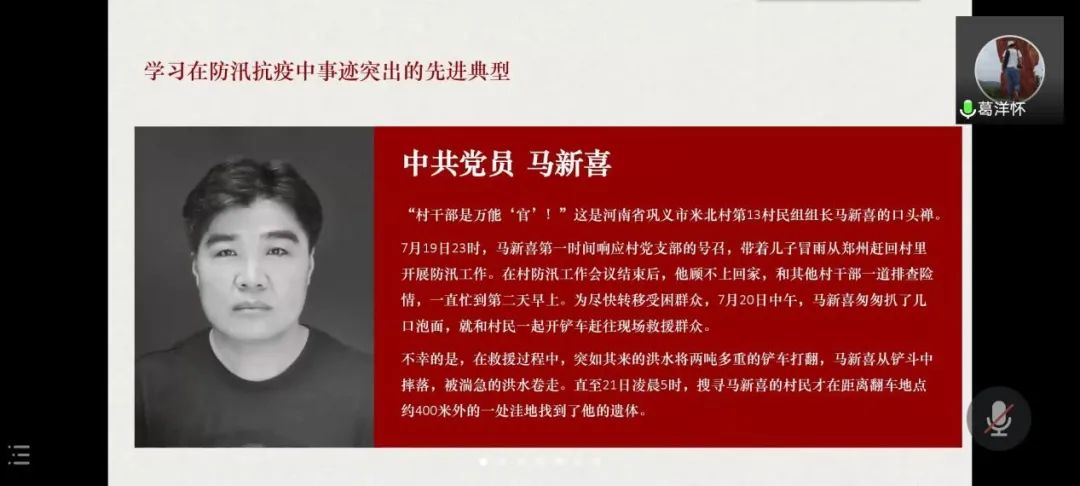 葛洋怀同志带领全体同志共同学习了在防汛抗疫中事迹突出的先进典型。包括“不相信有完不成的任务,不相信有克服不了的困难,不相信有战胜不了的敌人”,“三个不相信”精神的杨根思连;英勇奋战在防汛一线的郑州市郑东新区金光路党工委副书记、街道办主任中共党员任冀军和金光路街道办事处党政主任“拼命三郎”“工作狂”翟向以及巩义市米北村第13村民组组长马新喜等等;在抗疫一线奔波的张家界市公安局交警支队一大队民警杜汉明,还包括就发生在我们身边的,崇阳县石西庄村党支部书记代低归背着独居老人打疫苗的感人场景。