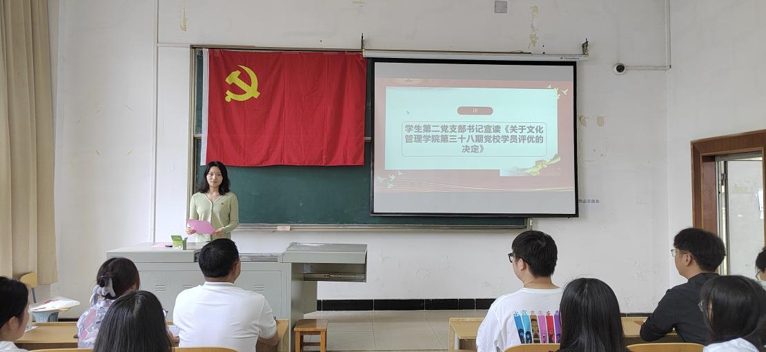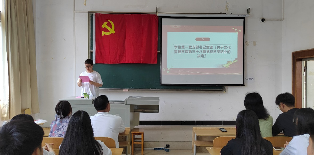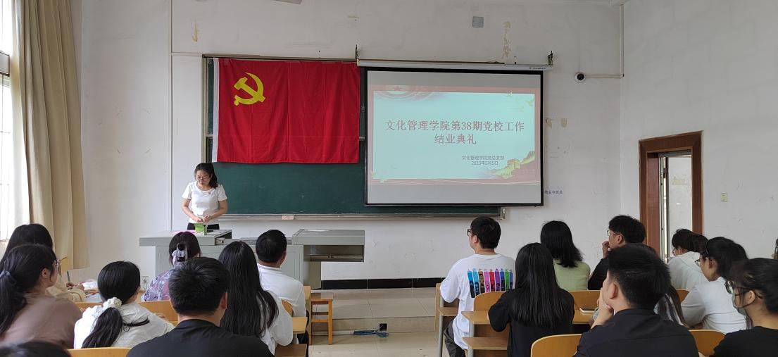 为弘扬百年党史,争做时代新人。落实党的二十大精神,为党组织选拔、培养、输送优秀青年,5月5日中午,文化管理学院分党校第三十八期党校工作结业式在5204教室举行。文化管理学院党总支书记、分党校校长张爱军,学生第一党支部书记王喆,学生第二党支部书记陈可冉, 党总支部组织委员武思雨, 团委书记汪丰毅,优秀教工党员代表袁知兰出席本次结业典礼。
