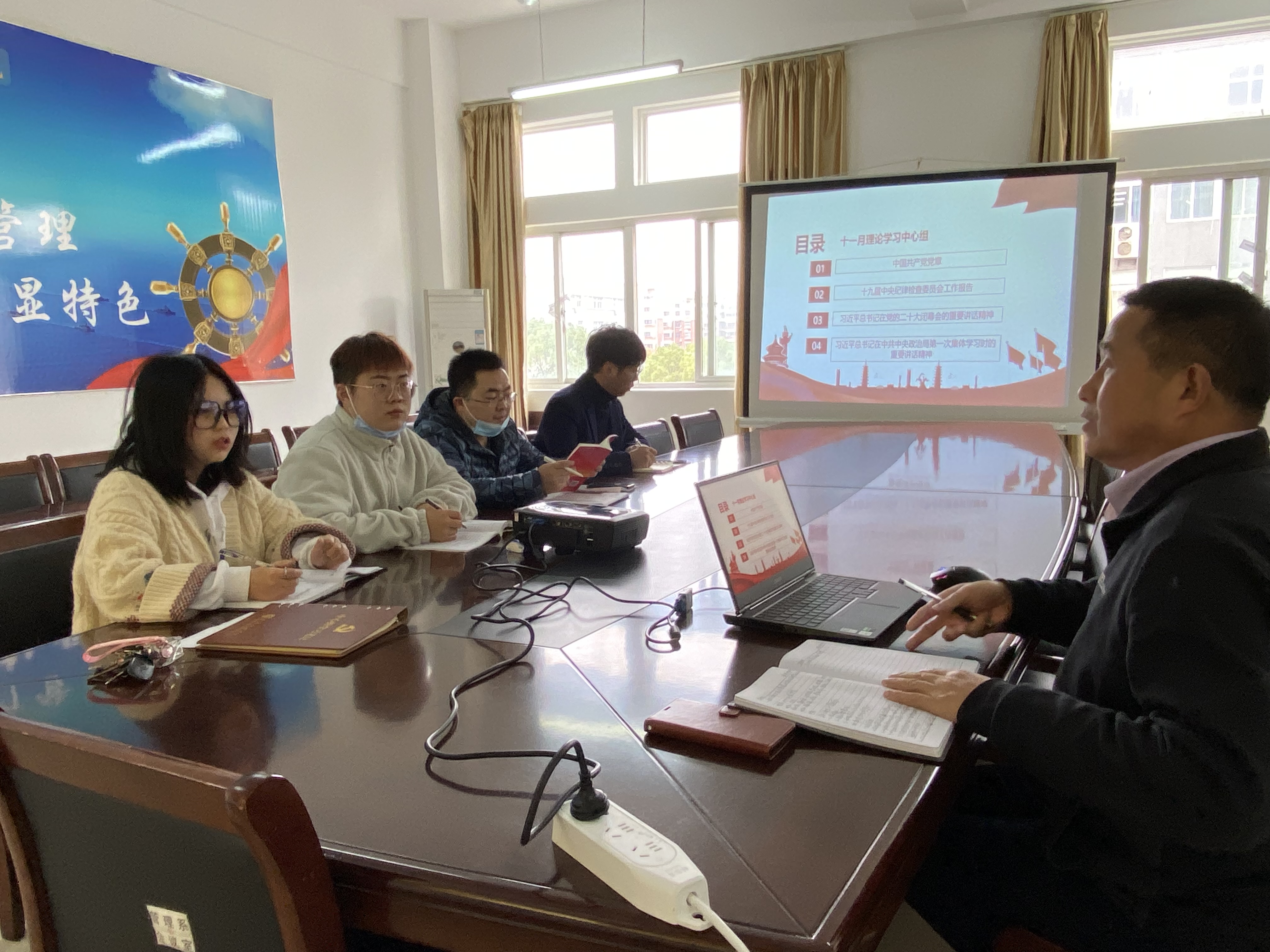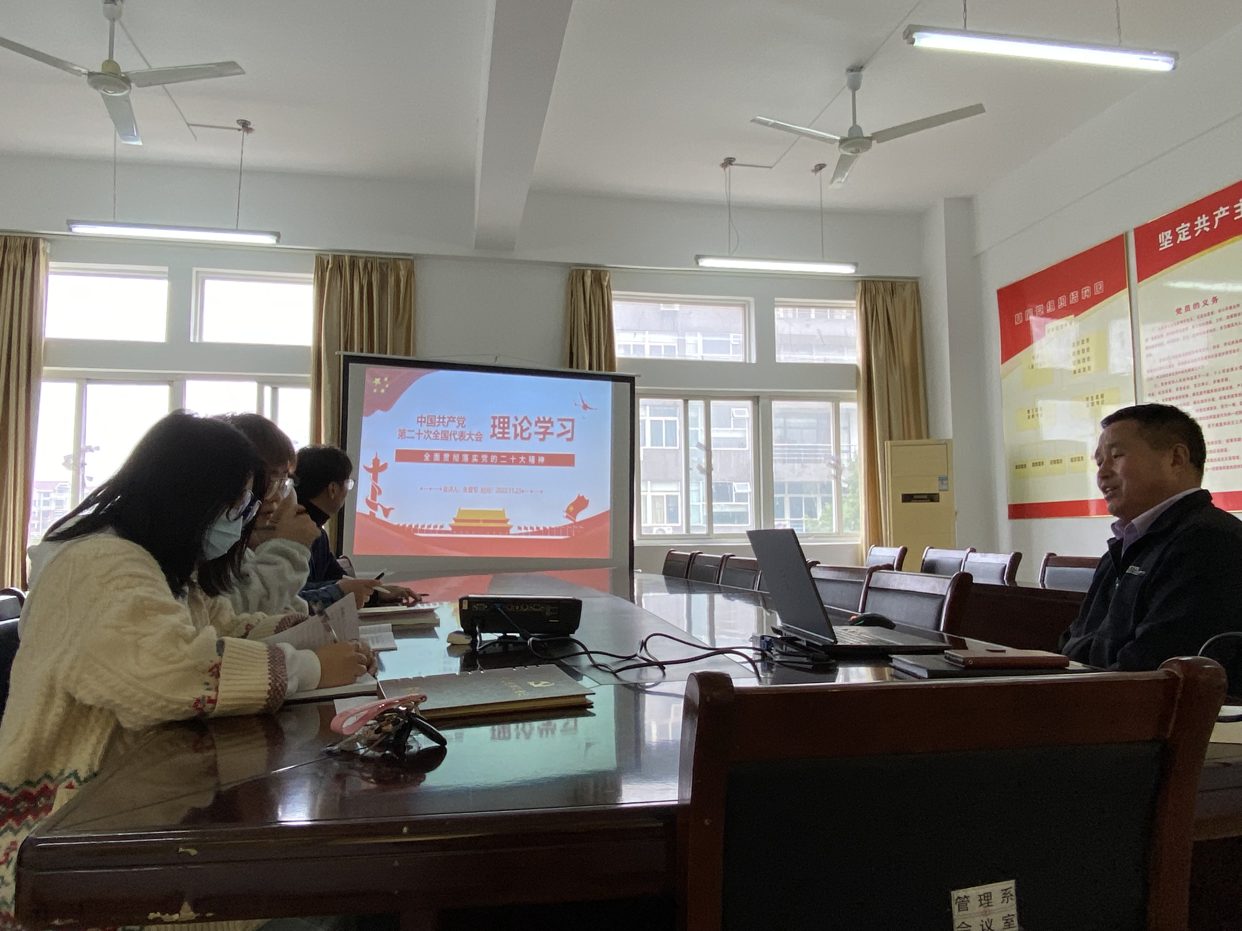 2022年11月23日下午,为深入学习党的二十大理论方针,领悟党的二十大在政治上、理论上、实践上取得的一系列重大成果,学习新时代新征程党和国家事业发展制定的大政方针和战略部署、党团结带领人民全面建设社会主义现代化国家、全面推进中华民族伟大复兴的政治宣言和行动纲领,文化管理学院党总支部书记张爱军同志同理论中心组全体成员进行了相关内容的学习。
