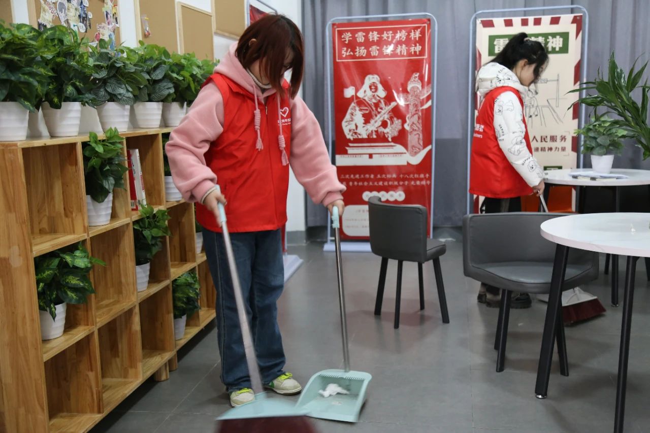 下午6点,全体人员参与学雷锋精神从小事做起,让大家把在书中感悟到的精神运用于实践之中,充分践行“雷锋精神”,在宿舍楼栋各处扫地、擦拭楼梯扶手、清理卫生死角。
