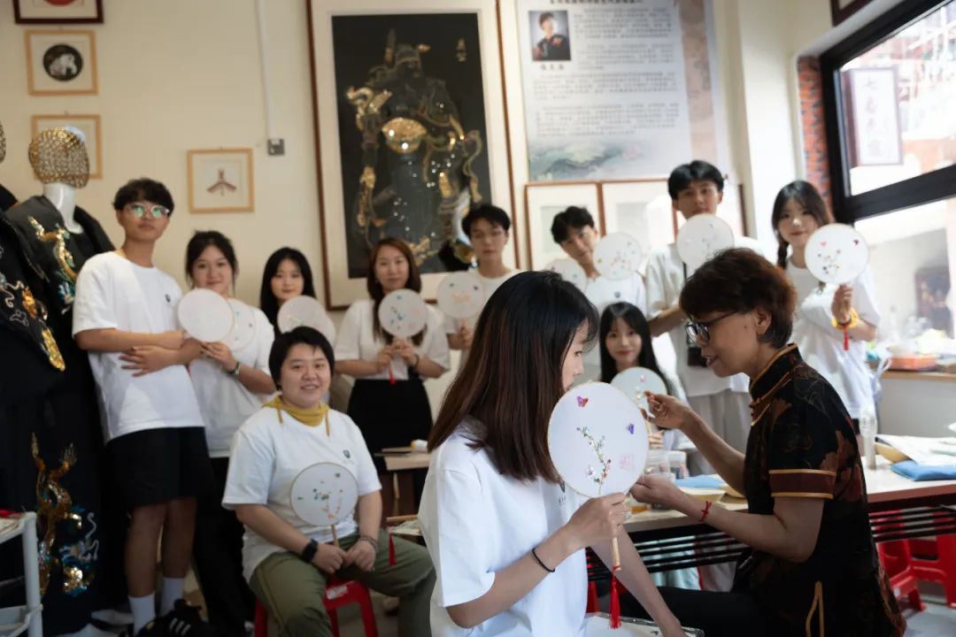 泉州珠绣制作技艺于2016年列入泉州市第五批市级非物质文化遗产名录,是在中国刺绣基础上发展而来的手工艺品,以多种色彩的珠粒,通过专业绣工纯手工精制而成。陈克忍老师为实践团队介绍了作品创作灵感以及珠绣历史文化底蕴,并亲自教授“珠绣”制作过程,从颜色搭配、珠花搭配、针法运用展示自己的珠绣技艺