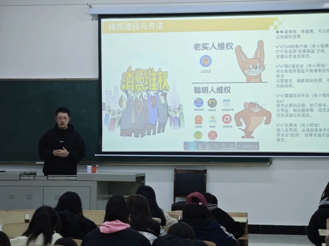 (通讯员 池鑫融)3月12日,我校新闻传播学院学生会权益部于武汉校区3204教室和大悟校区3101教室同步举行“权倾于心,益路同行”权益日活动。活动以“3·15国际消费者权益日”为契机,通过知识科普、案例剖析与趣味实践的方式,帮助同学们掌握维权技能,筑牢消费安全防线。