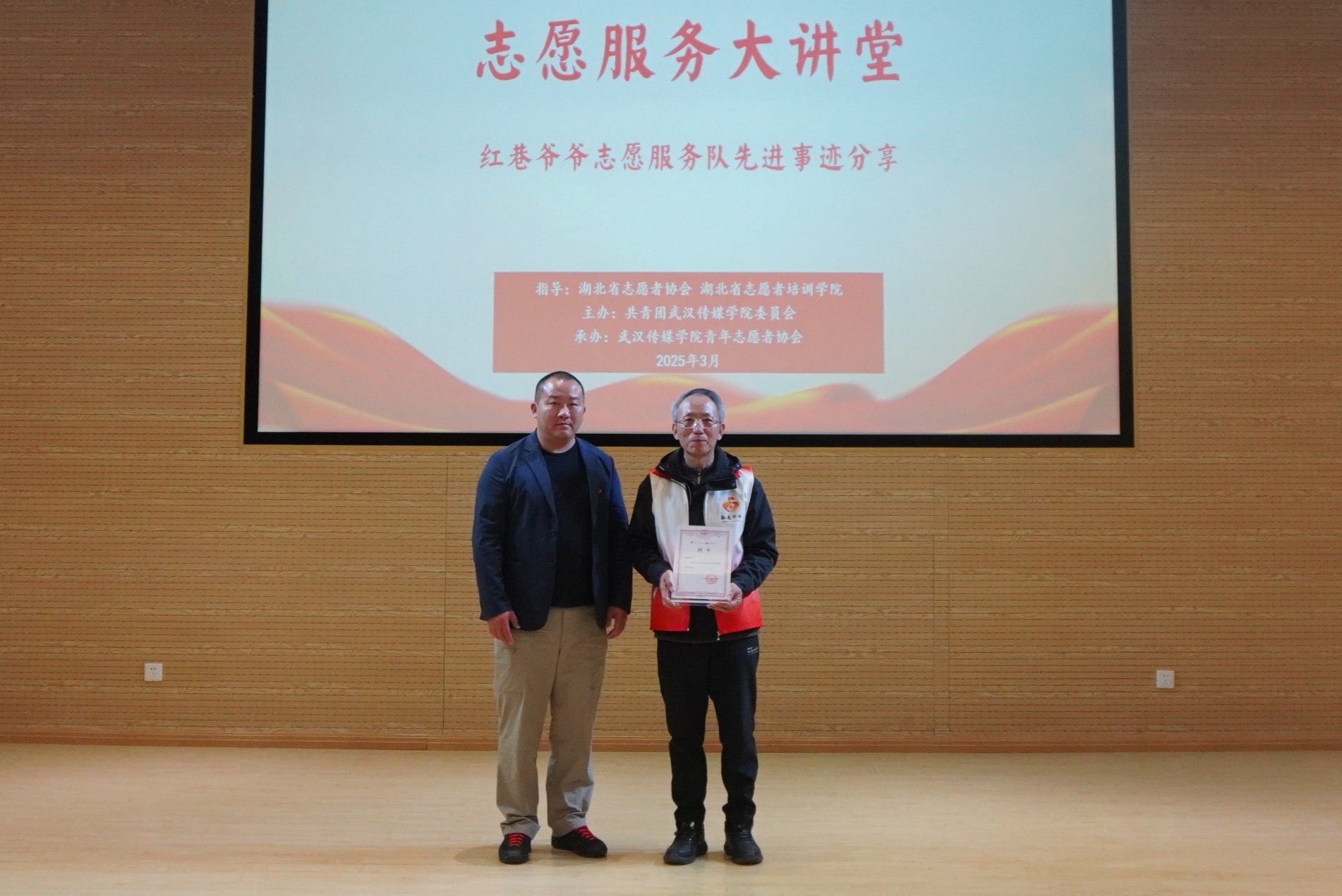 喻爷爷还结合自身经验,详细解答了如何结合退休党员干部的经验优势解决基层社会治理的问题,为同学们提供了宝贵的建议。为推动我校志愿服务事业的发展,学校聘请喻铭建同志为“志愿服务校外导师”,并由校团委书记瞿宗巍为其颁发聘书。在《唱支山歌给党听》节目中,“志愿服务大讲堂”的现场气氛达到了高潮,掌声雷动。