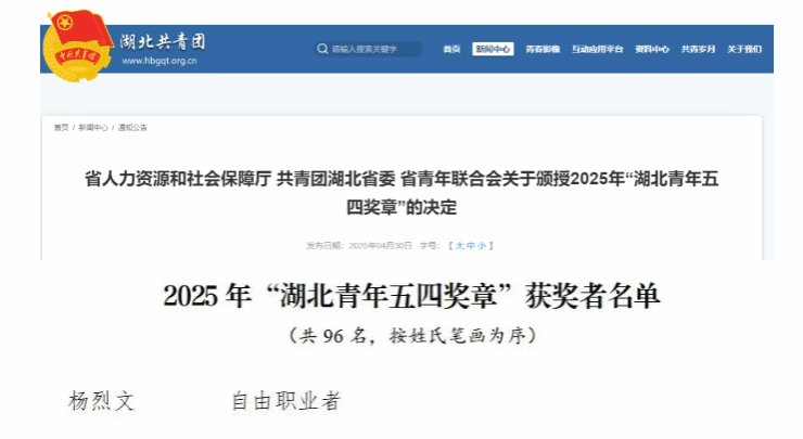 近日,湖北省人力资源和社会保障厅、共青团湖北省委、湖北省青年联合会联合发布表彰决定,授予96名同志“湖北青年五四奖章”。其中,米兰体育网页版登录2023届广播电视学专业毕业生杨烈文获此殊荣,这不仅是对他个人杰出贡献的肯定,也彰显了我校人才培养的显著成效。
