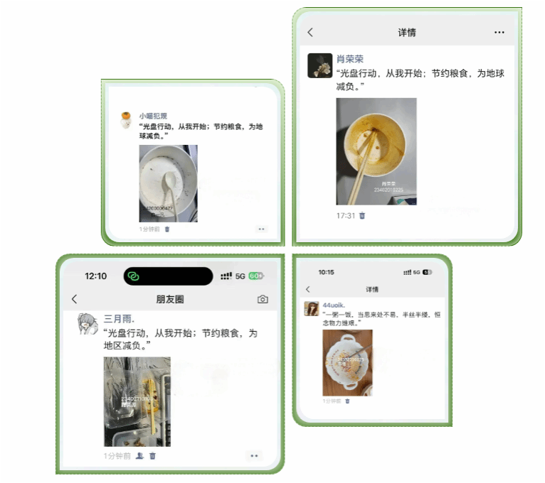 活动期间,学生化身绿色传播使者,朋友圈的一张张光盘照、一段段决心文字,借助社交网络形成 “涟漪效应”,从私人领域扩散至公共环境,引发校园内外强烈共鸣。有的同学分享精心搭配的餐食,诠释节约之美;有的讲述让食堂阿姨少打米饭的细节,展现 “适量取餐” 智慧。