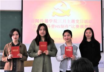 为学习两会精神,传播推广两会知识,紧跟国家步伐,新闻传播学院将本次活动结合本院系专业特色,开展成关于制作两会趣味科普H5的趣味比赛,以作品评比的形式科普并弘扬两会的精神。在本次活动评选中,梅兰、陈杨和陈思敏三位同志的作品脱颖而出,并在会议中进行了公示。