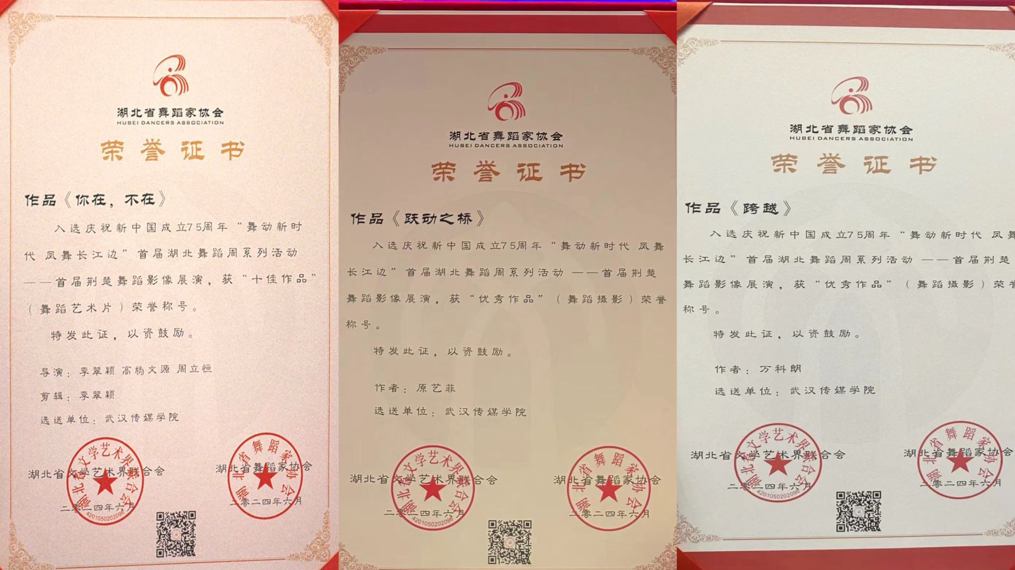 (通讯员:黄娴)6月20日晚,备受瞩目的“舞动新时代 凤舞长江边”首届湖北舞蹈周系列活动颁奖典礼在热烈的掌声中圆满落幕。在本次舞蹈周的激烈角逐中,我校人文与艺术学院舞蹈学专业入选三部作品脱颖而出,其中,由专业教师高杨文源、李翠颖、周立恒等联合导演的作品《你在,不在》舞蹈艺术片荣获“十佳作品”荣誉称号;由杨文源老师与李翠颖老师共同指导的原艺菲同学和万科朗同学所带来的作品,《跃动之桥》和《跨越》,荣获“优秀作品”荣誉称号。