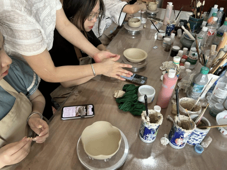 我校团队成员有幸亲身体验了陶瓷制作的全过程,从最初的揉泥开始,团队成员们便感受到了陶瓷制作的基础与关键。泥土在指间逐渐变得柔软而富有韧性,这一过程不仅考验着对材料的掌控力,更让每个人深刻体会到了“匠人精神”中对于细节的极致追求。