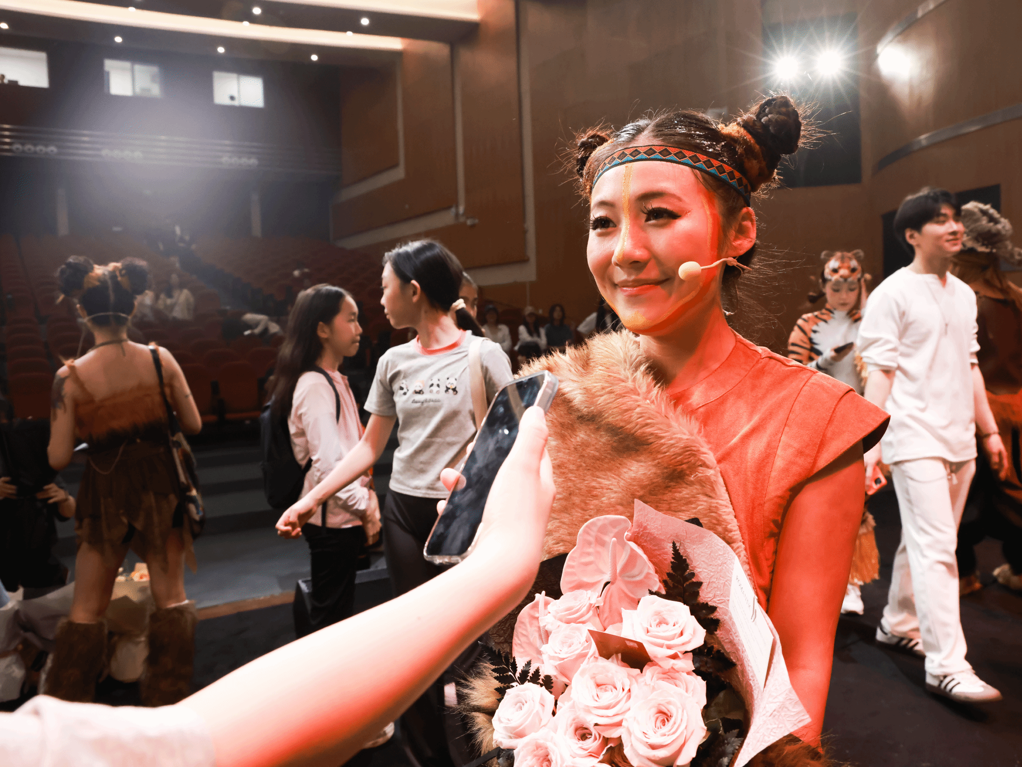 饰演小辛巴的刘子涵表示:“这次演出的角色都是动物,台词和形体都需要根据角色特性精心准备。剧中大量的唱跳对体力要求极高,操场成了我的第二个家。每天排练结束后,我都会去操场边跑边说,锻炼气息。”