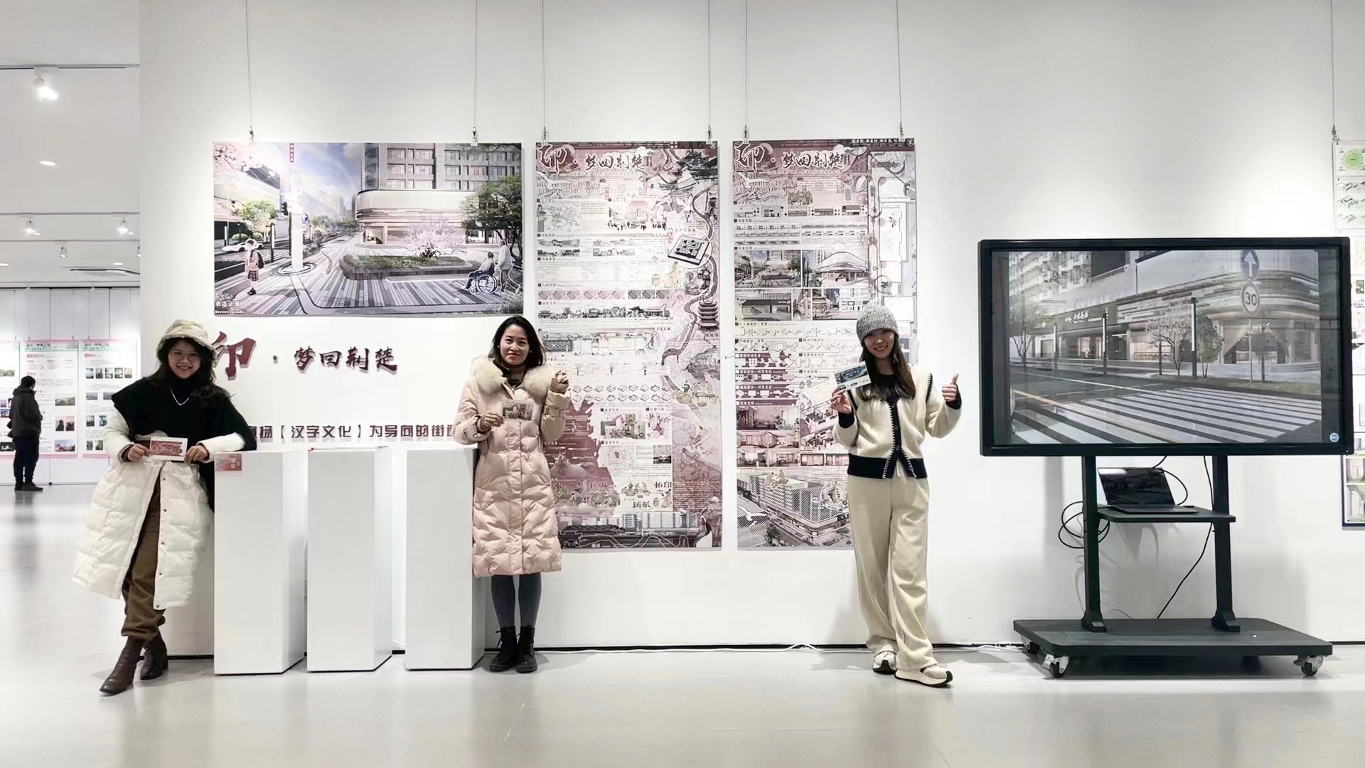 在展厅内,一组诗画场景布置格外吸引眼球。“眼前场景通过虚拟增强技术、AR眼镜,可以将参观者带入立体三维空间。”数学媒体艺术专业教师喻昕表示,他们团队三名老师通过两周时间设计好三维建模,软件均是自己设计。