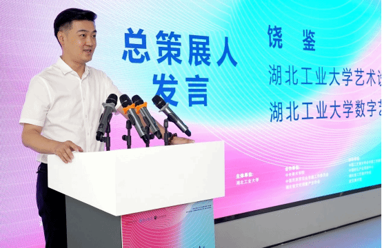 饶鉴教授代表展览策划团队在开幕式上致辞。他指出,本次展览是“守正创新·当代华章”高校巡展的第一站,旨在通过巡展模式,进一步深化探讨中华工艺传承与数字文创设计的融合之道,激发青年学子对传统工艺的兴趣与创新思维,促进中华优秀传统文化在大学校园中的传播与发展,为文化创意产业的培育和发展贡献智慧与力量。