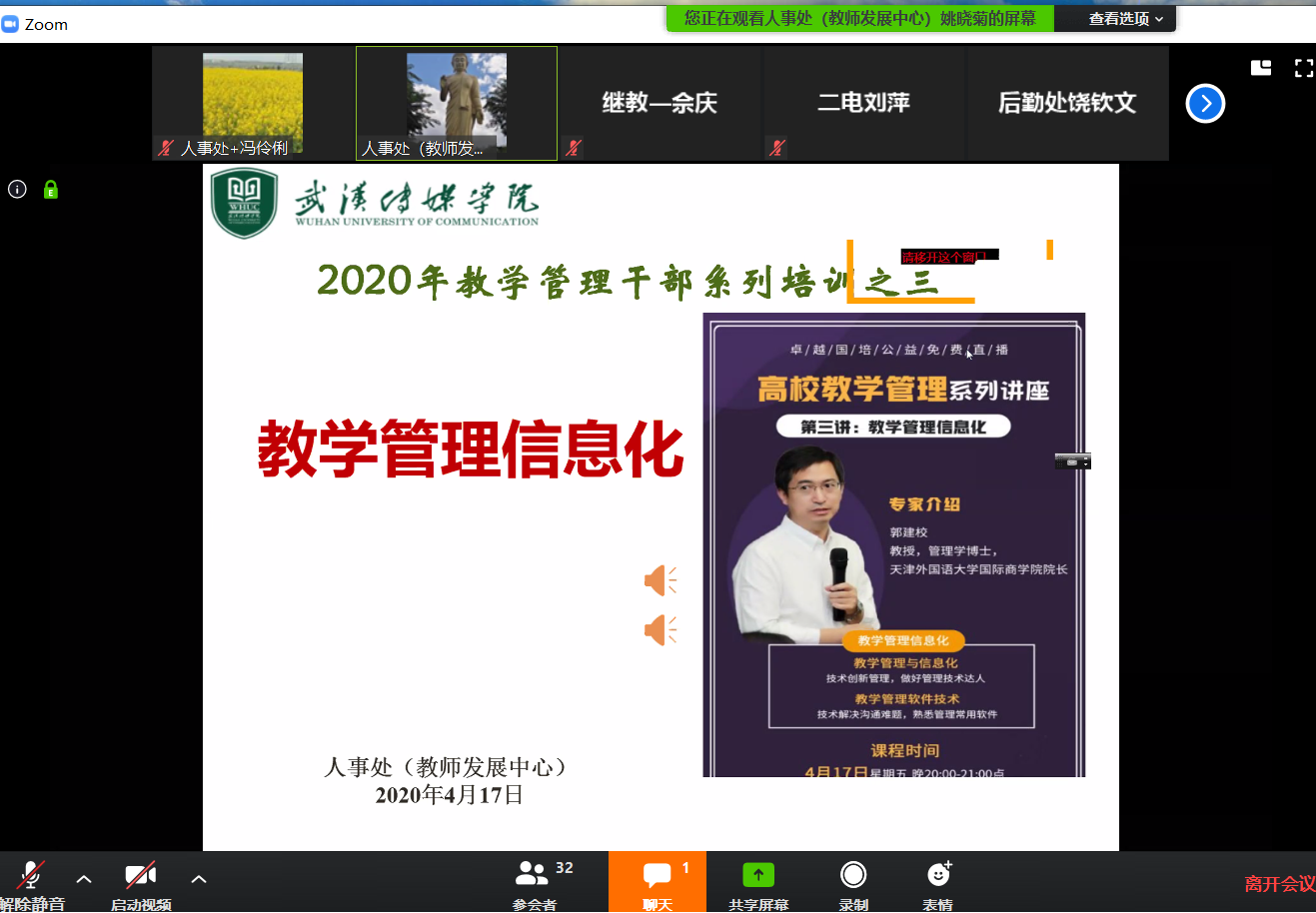 4月17日,教师发展中心组织学校教学和行政管理干部通过ZOOM平台参加了《教学管理信息化》专题直播讲座,学校各学院党总支书记、教学副院长、教研室主任、教秘、行秘和全体行政职能部门副科级以上干部及教学管理相关人员等92人参加了本次培训。会议分两个会场,分别由由学校校长助理、人事处(教师发展中心)姚晓菊和人事处(教师发展中心)处长助理王静主持。