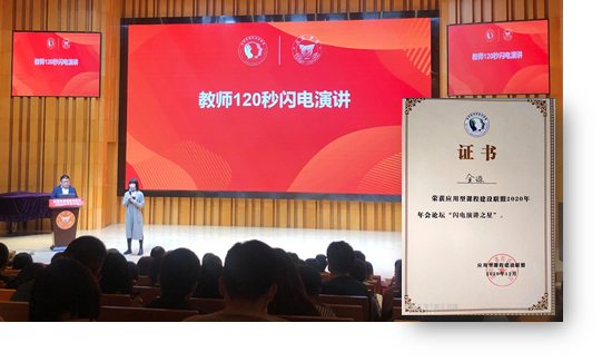 在会议的教师闪电演讲环节,我校电影与电视学院副教授金琛老师就其“疫情期间网络授课与课程思政”的方式方法做了交流,并获得组委会特别颁发的演讲奖状。