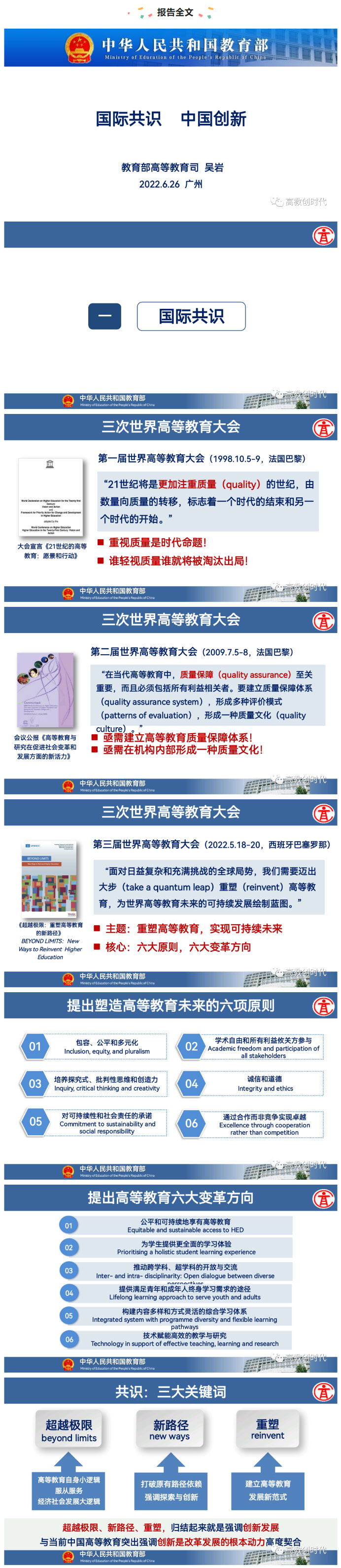 所以这个变化总结一下第三届世界高等教育大会的三个关键词:超越极限(beyond limits)、新路径(new ways)、重塑(reinvent)。这三个关键词就是让我们高等教育发展自身的小逻辑要服务服从社会经济发展的大逻,要超越高等教育的围墙,自身在内部要打破原有学科专业的固化壁垒。新路径是打破原先高等教育的路径障碍,要强调探索和创新。重塑是要建立高等教育发展的新范式。这三个关键词归结起来就是:创新发展。创新是改革发展的根本动力!第三届世界高等教育大会的主题和中国高等教育发展的根本动力是高度契合的、同频共振的。